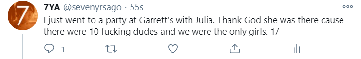 I just went to a party at Garrett’s with Julia. Thank God she was there cause there were 10 fucking dudes and we were the only girls.